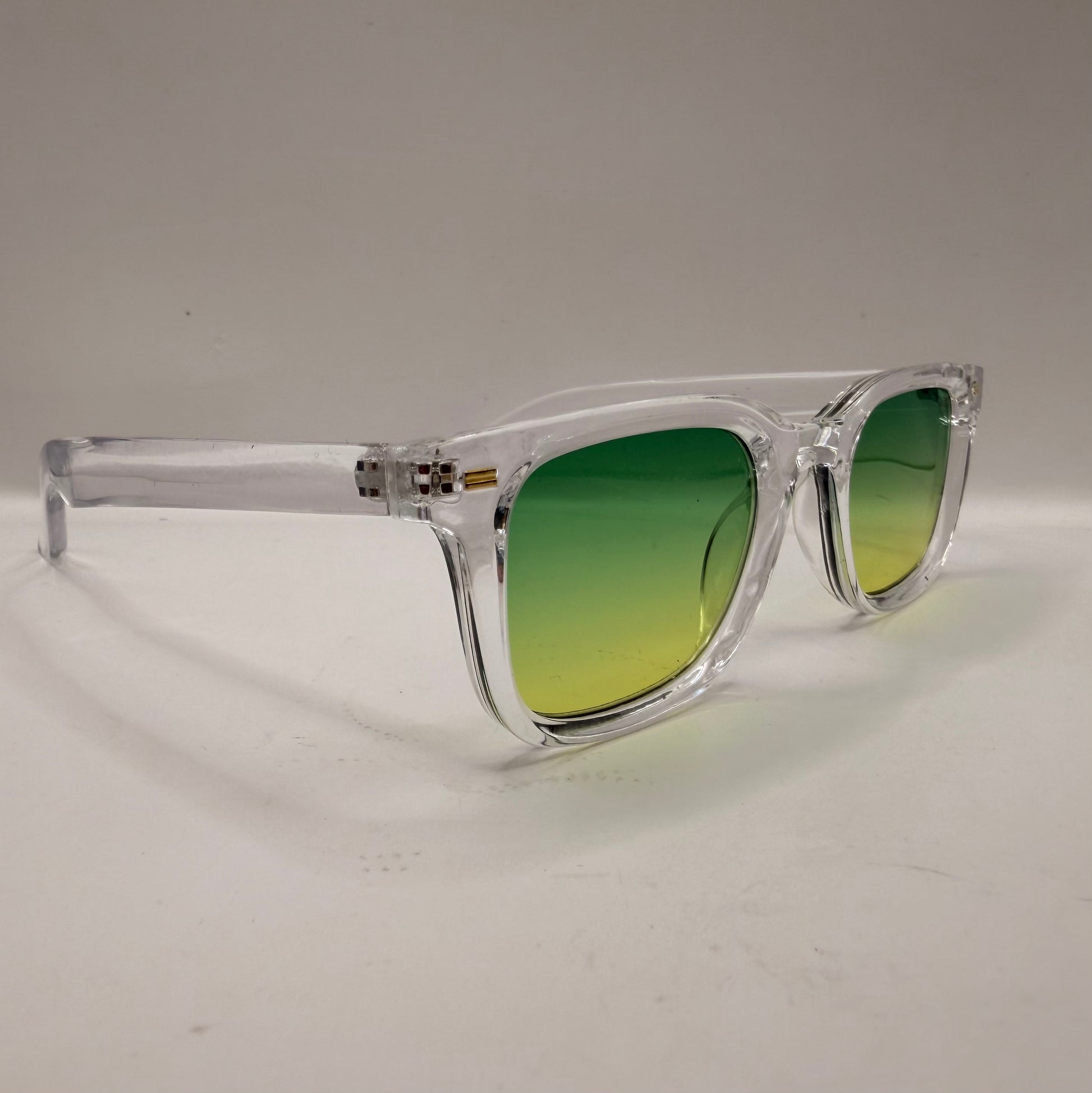 Su montura transparente aporta ligereza visual y estilo contemporáneo, mientras que las lentes degradadas verde-amarillo crean un efecto vibrante y veraniego perfecto para cualquier ocasión.